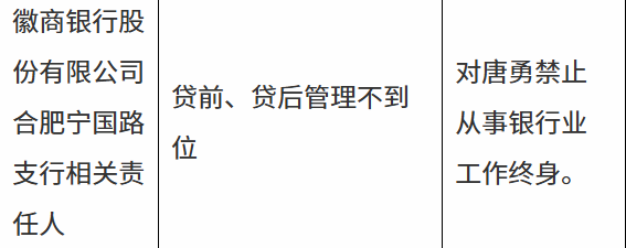 10月24日,国家金融监督管理总局安徽监管局行政处罚信息公开表显示,徽商银行股份有限公司合肥宁国路支行相关责任人唐某因贷前、贷后管理不到位被禁止从事银行业工作终身。